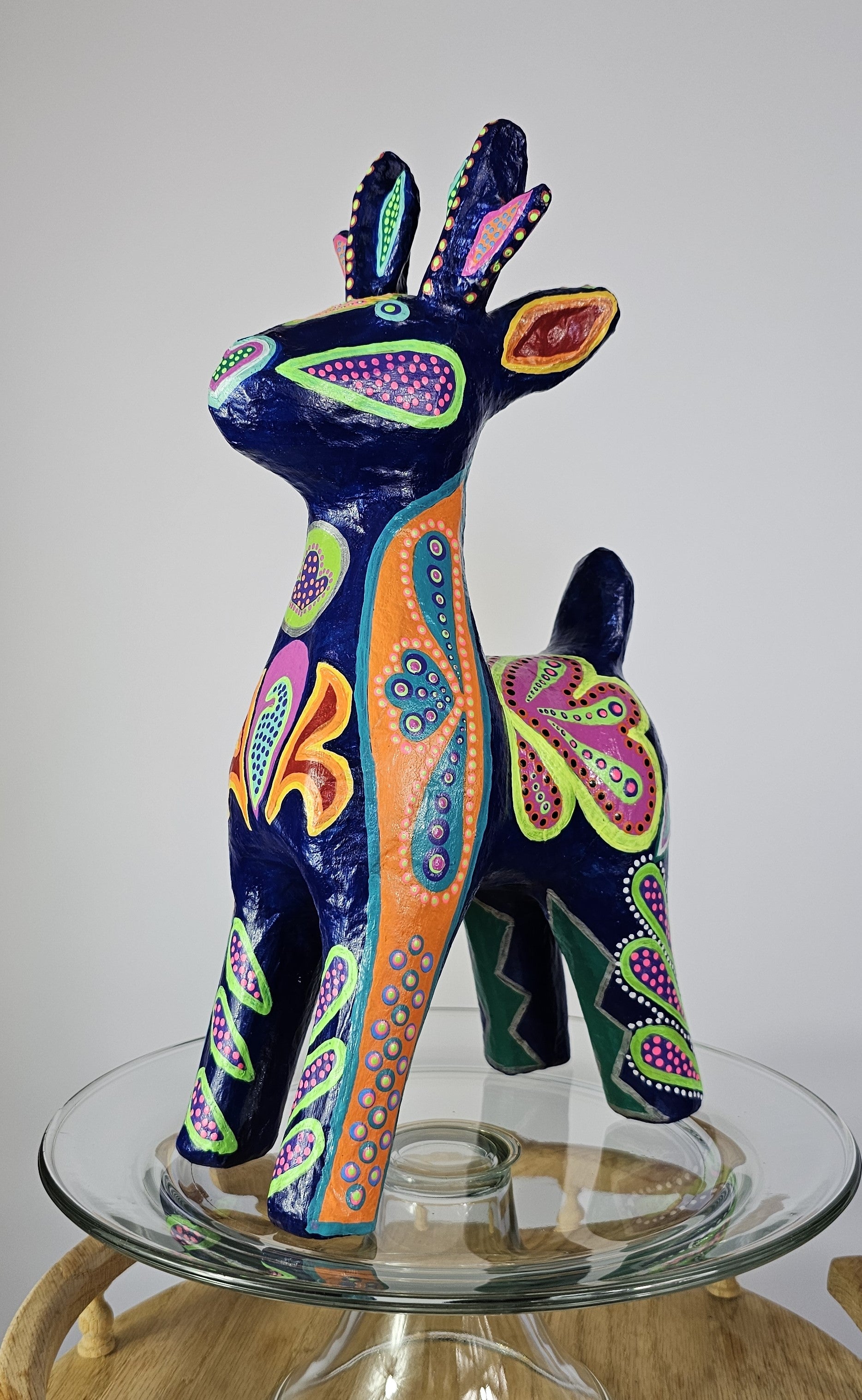 Painted on a papier-mâché-like material, this piece is inspired by the colorful and alluring Mexican alebrije artwork and sculptures.