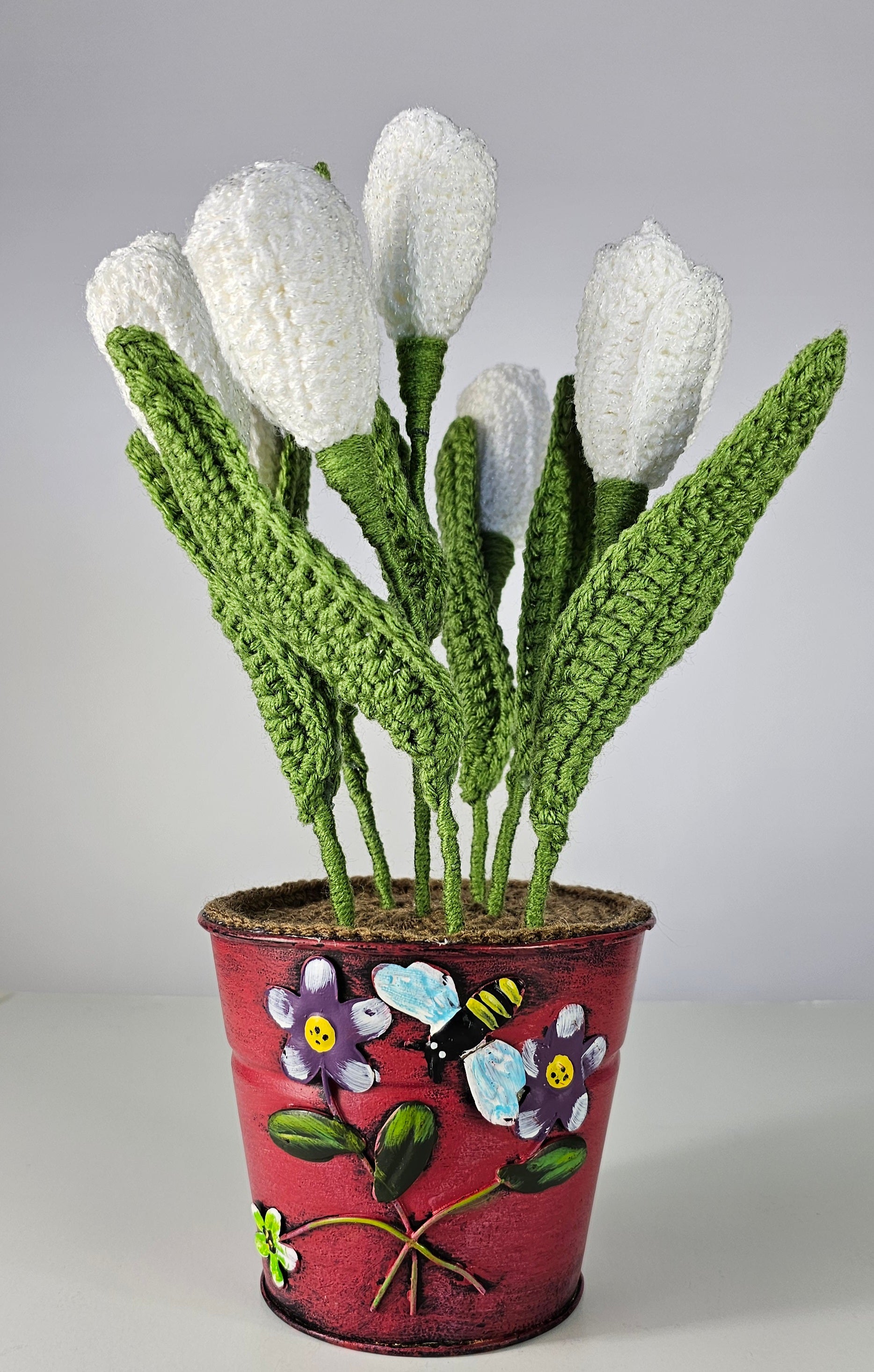 Timeless elegance, crafted in yarn. This charming bouquet of white yarn tulips brings a touch of everlasting springtime to your space.